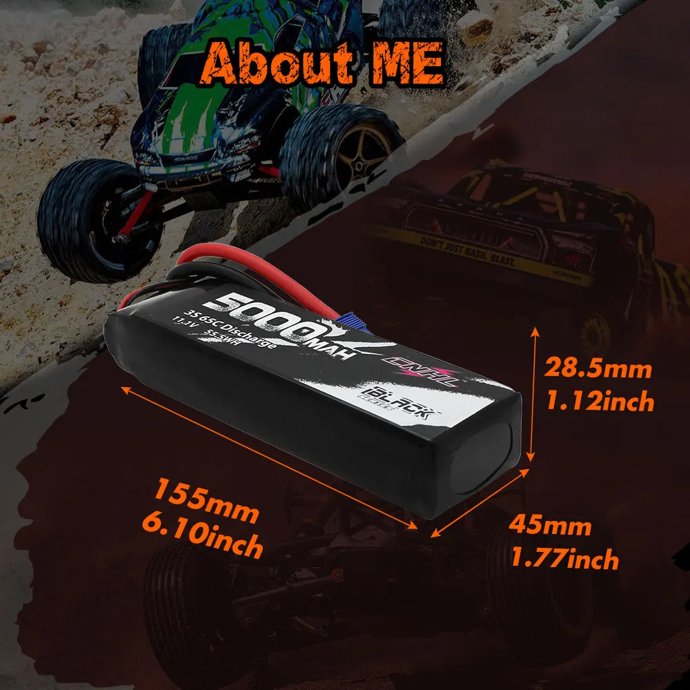 CNHL 5000mah 3s 65c lipo battery fit E-flite 1.5m RC airplanes and 1/5 1/7 1/10 RC cars such as Arrma, Losi, and Traxxas RC cars. In the Traxxas series, they are available for Drag Slash, Sledge, E-Revo / VXL, XO-1, Unlimited Desert Racer/UDR, and Rustler VXL models. For the ARRMA series, they are for the most part most widely used in the Typhon and Outcast models.