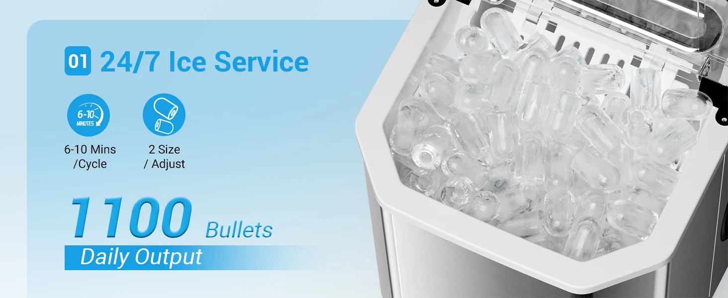 Ultra-Fast 6-Minute Ice Making Enjoy 9 fresh, bullet-shaped ice cubes in just 6 minutes, with a high capacity of 26 lbs per 24 hours to meet all your entertaining and daily needs.