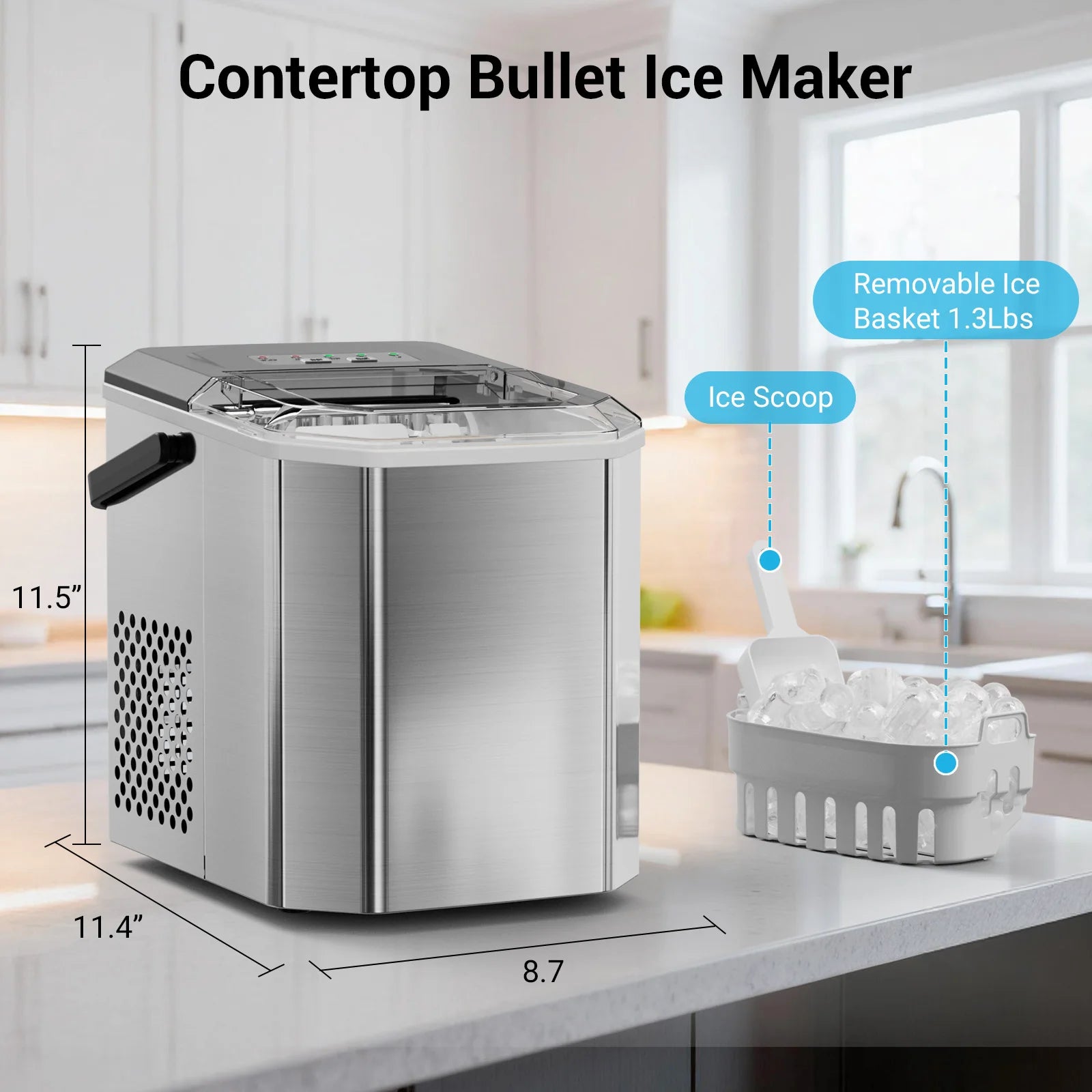 Fast Ice Making&Engery Saving: Fast, Energy Efficient Ice-Making. Portable countertop ice maker let's you enjoy 9 bullet-shaped ice cubes in just 6 minutes. Make 26 lbs of ice in 24 hours on less than 0.1kWh on average per hour—great value for daily household use.