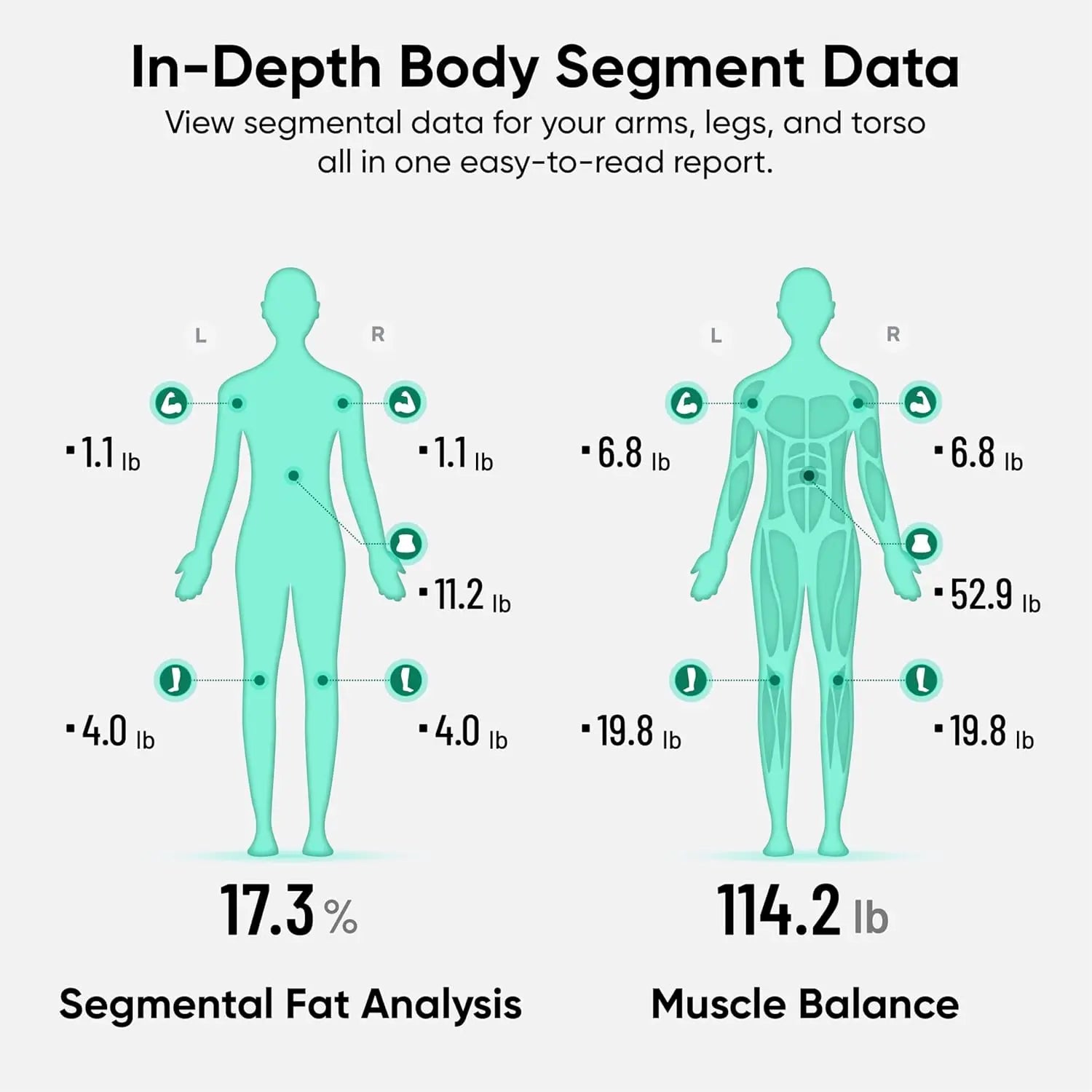 Advanced Body Composition PDF Report - Access a detailed breakdown of your entire body composition and track changes over time. Segmental data for your arms, legs, and torso are clearly displayed in one easy-to-read report, helping you visualize your progress with confidence.